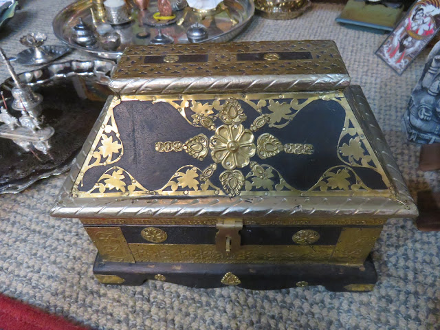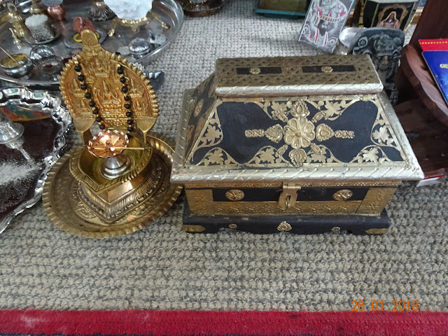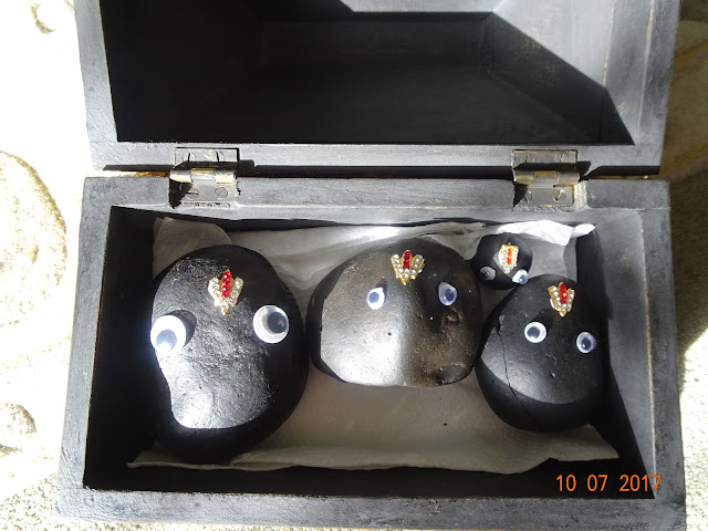 எங்கே வைக்கலாமுன்னு யோசிச்சு, கேரள டிஸைன் ஆபரணப்பெட்டி வீட்டில் இருக்கேன்னு அதில் வச்சேன். இதுநாள் வரை சும்மாக் காலியா ஷோ கேஸில் இருந்த பெட்டி, சாளக்ராமத்துக்குக் காத்துருந்ததோ என்னவோ! (இந்தமாதிரிப் பெட்டியில்தான் (பெரிய சைஸில் இருக்கும்) ஐயப்பன் நகைகளை சபரி மலைக்குக் கொண்டு போவாங்க. திருவாபரணப் பெட்டியாக்கும், கேட்டோ! )