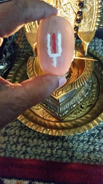 நம்ம வீட்டில் சாளக்ராமக்கற்களை பூஜைக்குத் தயார் செஞ்சப்ப, இதுக்குன்னே முதல்நாள் கடையில் வாங்கிய புத்தம்புது பாத்திரத்தை எடுத்து அதில் வெந்நீர் நிரப்பி சாளக்ராமங்களைக் குளிப்பாட்டி, அப்புறம் தண்ணீரை எடுத்துட்டுப் பால் ஊற்றி அதில் கழுவி எடுத்தேன். பெரிய க்ளியோபாட்ராப்பா இந்தக் கற்கள்! அப்புறம் இன்னொரு நீர் அபிஷேகம். அப்புறம் புத்தம் புது கைத்துவாலையால் தொடைச்சு எடுத்து பசும்நெய் துளி எடுத்து எல்லோருக்கும் நெய்ப்பூச்சு போட்டதும் பளபளா! நெய் ஒட்டாமல் இருக்க டிஷ்யூ பேப்பர் அடியில். நாஞ்சொல்லலை... நம்ம வீட்டுக்குன்னு யார் வந்தாலும் நாமத்தைச் சாத்திருவேன்னு... ஹிஹி.... அதே போல நால்வருக்கும் நாமம் சாத்தியாச்!