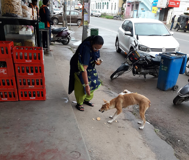 காலை ஏழுமணிக்கெல்லாம் ரெடி ஆகிட்டோம். பேக்கிங் எல்லாம் ஆச்சு. நம்ம ட்ரைவர் அசோக் குளிக்க நம்ம காட்டேஜ் சாவியைக் கொடுத்துட்டு, அன்னபூர்ணேஸ்வரியில் போய் ஒரு காஃபி குடிச்சுட்டு வரலாமேன்னு சின்னநடையில் போய் காஃபி ஆச்சு. வெளியே வரும்போது ஒரு செல்லம் எனக்காகக் காத்திருந்தது. பக்கத்துப் பொட்டிக் கடையில் ஒரு பிஸ்கட் பாக்கெட் வாங்கி அதுக்குப் போட்டேன். தின்னுட்டுக் கூடவே நடந்து வந்துச்சு :-)