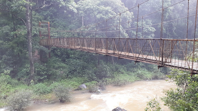 தண்ணீர் விழுந்து ஒரு ஆறு ஓடுது... அதுக்குக் குறுக்காக ஒரு கம்பிப்பாலம். பாலத்துக்குப் போகும் வழி அடைச்சுருந்தது. தண்ணீர் வரத்து அதிகம் என்பதால் மூடி வச்சுருக்காங்களாம். டேஞ்சர் ஸோன்!
